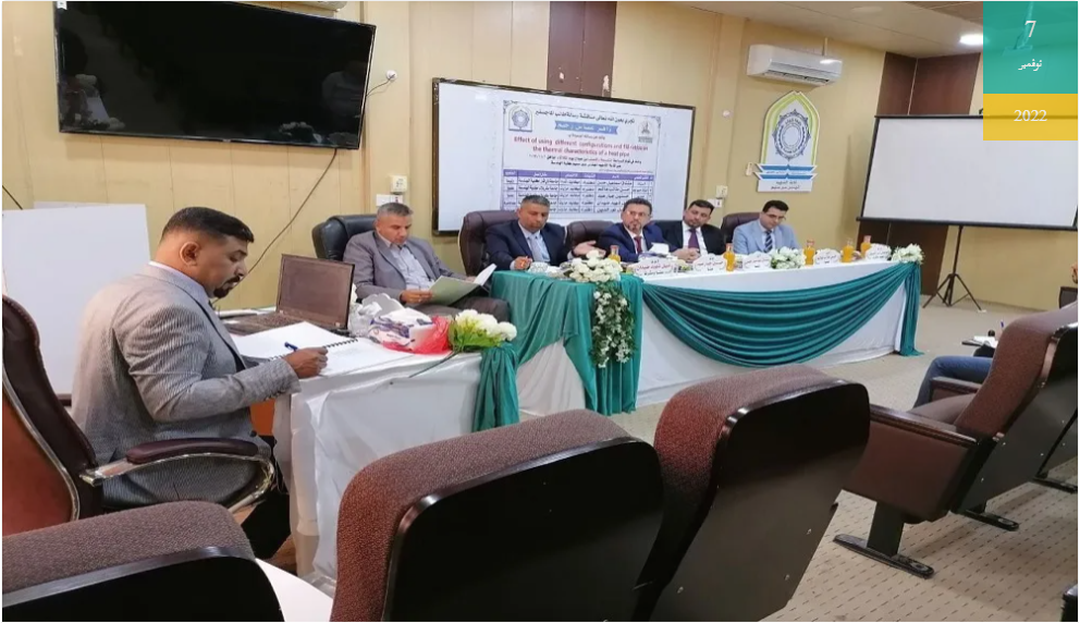 Assistant Professor Dr. Hassan Taleb Hashem participated in the discussion of a master's thesis by a researcher from the University of Karbala tagged (The effect of using different configurations and filling ratios on the thermal properties of a heat pipe) The thesis aimed at building a test platform for heat pipes, experimental investigation into the effect of operating conditions and design parameters on the performance of the proposed heat pipe and conducting an analysis of experimental measurements to obtain parameters that describe the thermal performance of the heat pipe.