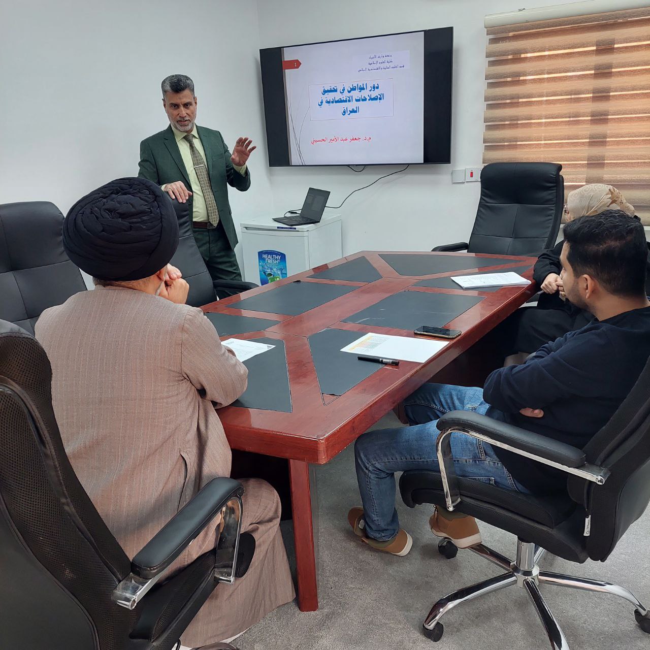 Assistant Professor Jaafar Abdul Amir al-Husseini gave an inspiring lecture on the economic challenges facing Iraq after 2003. Al-Husseini reviewed the negative effects of trade openness decisions and the financial and monetary challenges that led to paralysis in some economic sectors.