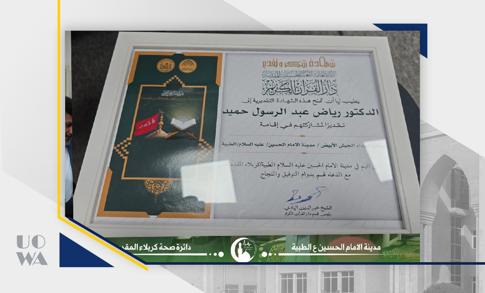 The Holy Shrine of Imam Hussein, in cooperation with the Medical City Administration, held a White Army gathering for the martyrs who were martyred in the Corona pandemic, in the hall of the late Dr. Muhammad Ali Al-Sharifi, may mercy and forgiveness be upon their pure souls. On this occasion, a group of heroes of the White Army who contributed to defeating the Corona aggression were honored, and among this group is ((Professor Dr. Riyad Abdul Rasoul Al-Haniwa), a lecturer specializing in chemistry at the College of Medicine / University of Warith Al-Anbia, as he was a supervising, following-up, treating and volunteering doctor to conduct the necessary examinations to challenge and repel this fierce enemy. Congratulations to Dr. Riyad Haniwa and his distinguished college of Warith Medicine (peace be upon him), with wishes for success and success always...