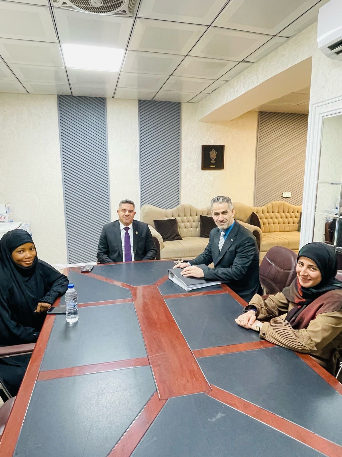 The Deanship of the College of Nursing, represented by its Dean and the Dean’s Assistants for Academic and Administrative Affairs, meets with the Nigerian student accepted for the free scholarship seat and sets an educational schedule for her that suits her condition.