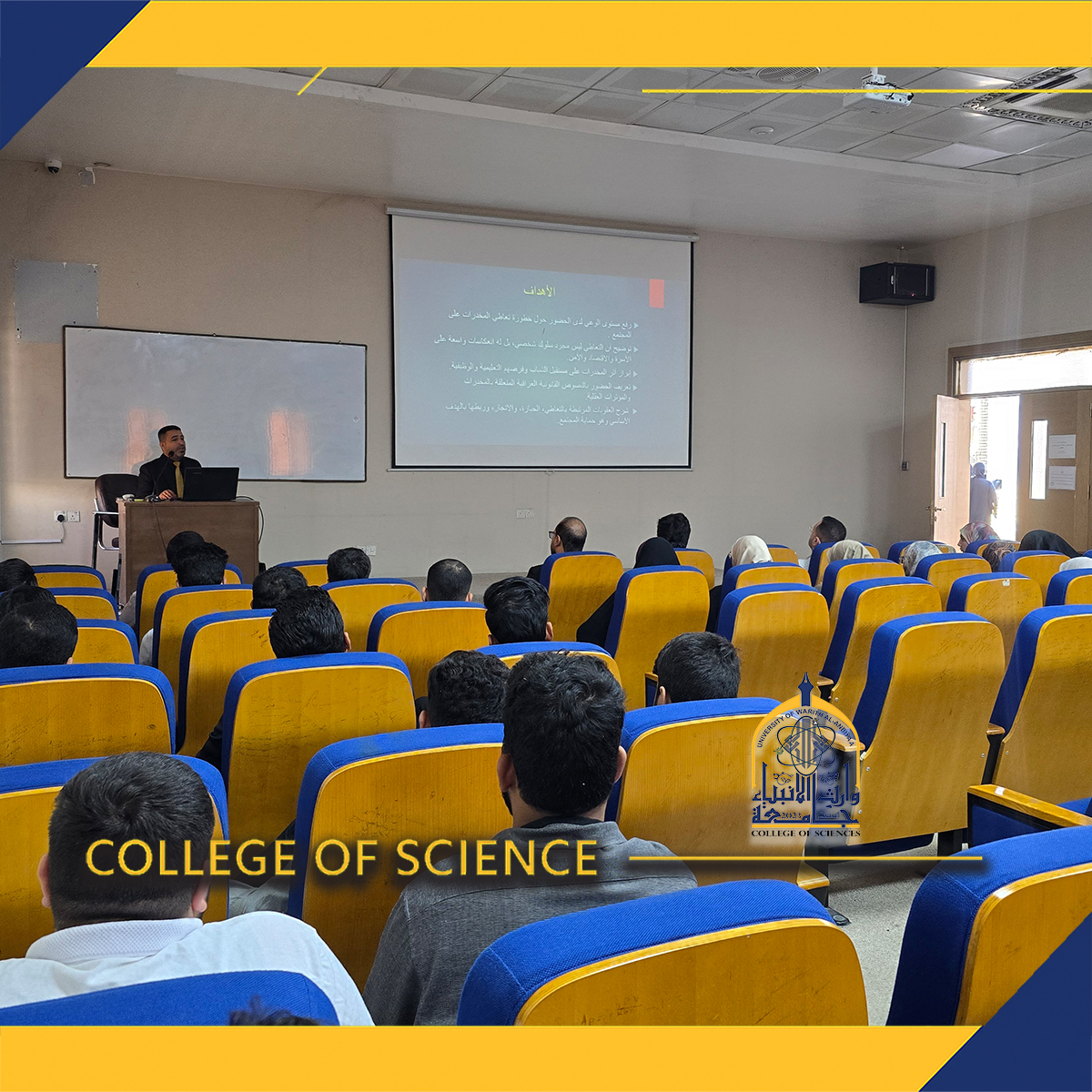 The College of Science at the University of Warith Al-Anbiyaa (peace be upon him) organized an awareness workshop entitled The Impact of Drug Abuse on Society, presented by faculty member Assistant Lecturer Abbas Taher, with the participation of students and academic staff.