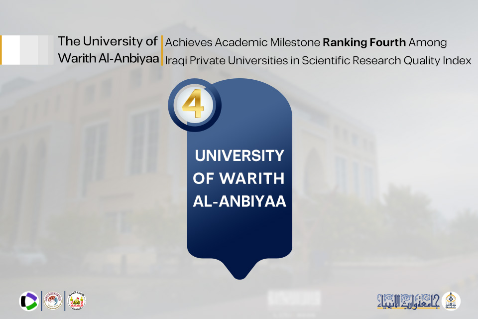 The University of Warith Al-Anbiyaa (PBUH) has achieved a new academic milestone by securing fourth place among private universities and twelfth place among all Iraqi public and private universities in the Research Quality Index issued by the Ministry of Higher Education and Scientific Research. The index is based upon data from research publications indexed in Web of Science for the period 2020–2024.